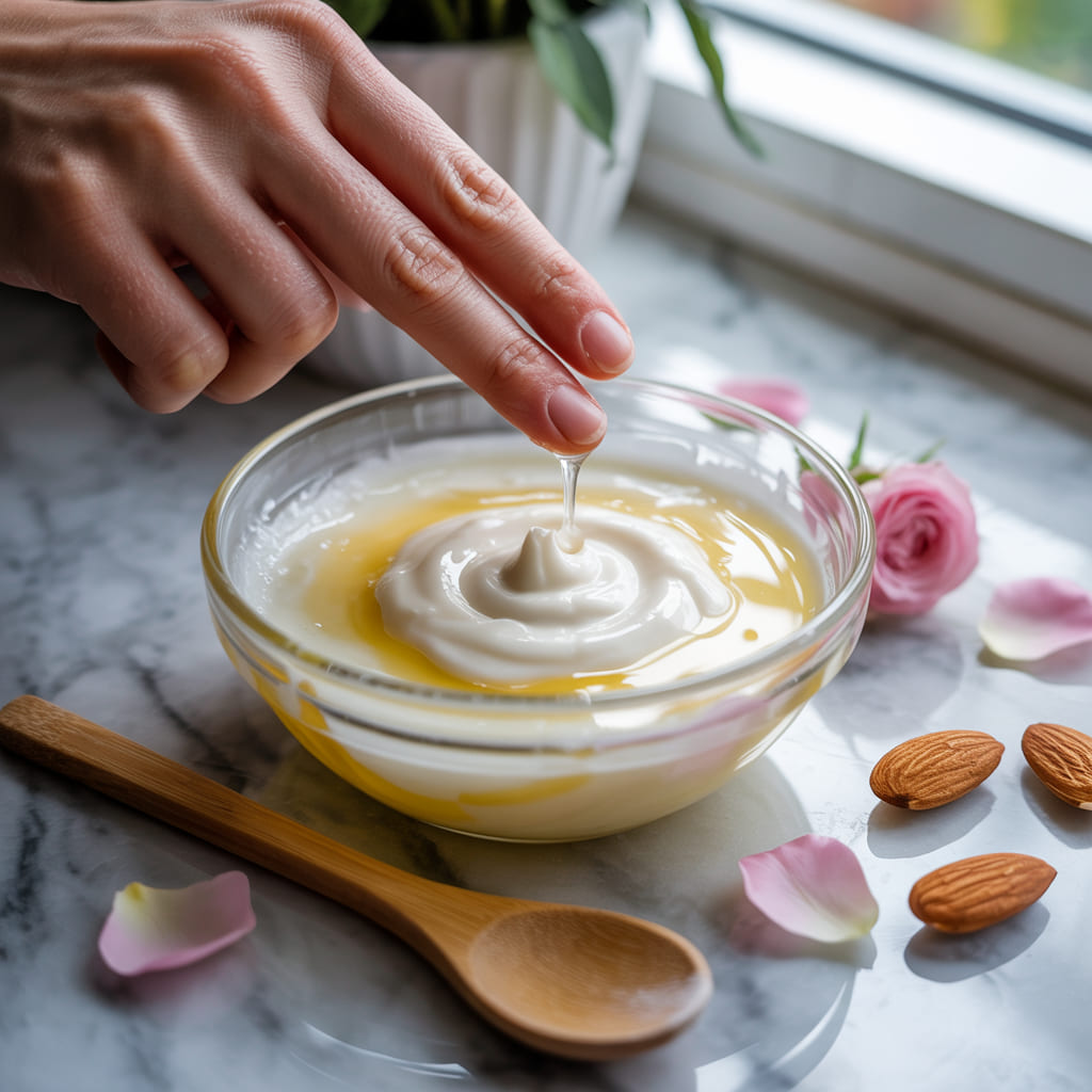 That’s all. Three gentle things that blend into a smooth, comforting cream. The shea butter gives the blend a creamy base. The almond oil adds softness without heaviness. And the rose water brings a feminine softness that makes the whole mixture feel calming and warm.