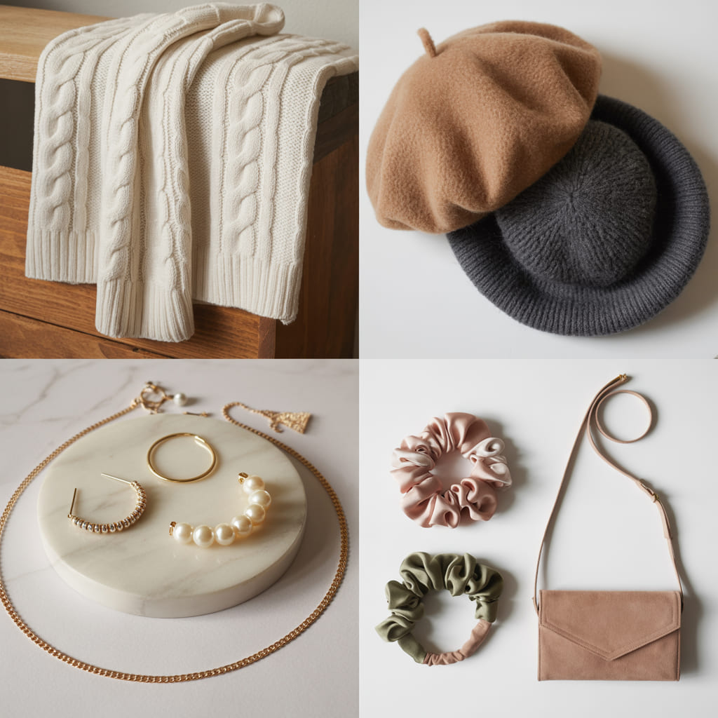 Accessories make even a simple outfit feel polished and personal. A cream beret and gold earrings can turn a basic sweater into something romantic and Parisian.
