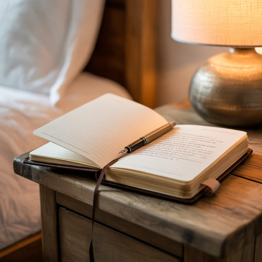 Sometimes I write sitting up in bed. Sometimes I write while the lamp is still on. Sometimes I write with my head already against the pillow, nearly falling asleep. The flexibility keeps it comforting instead of rigid.